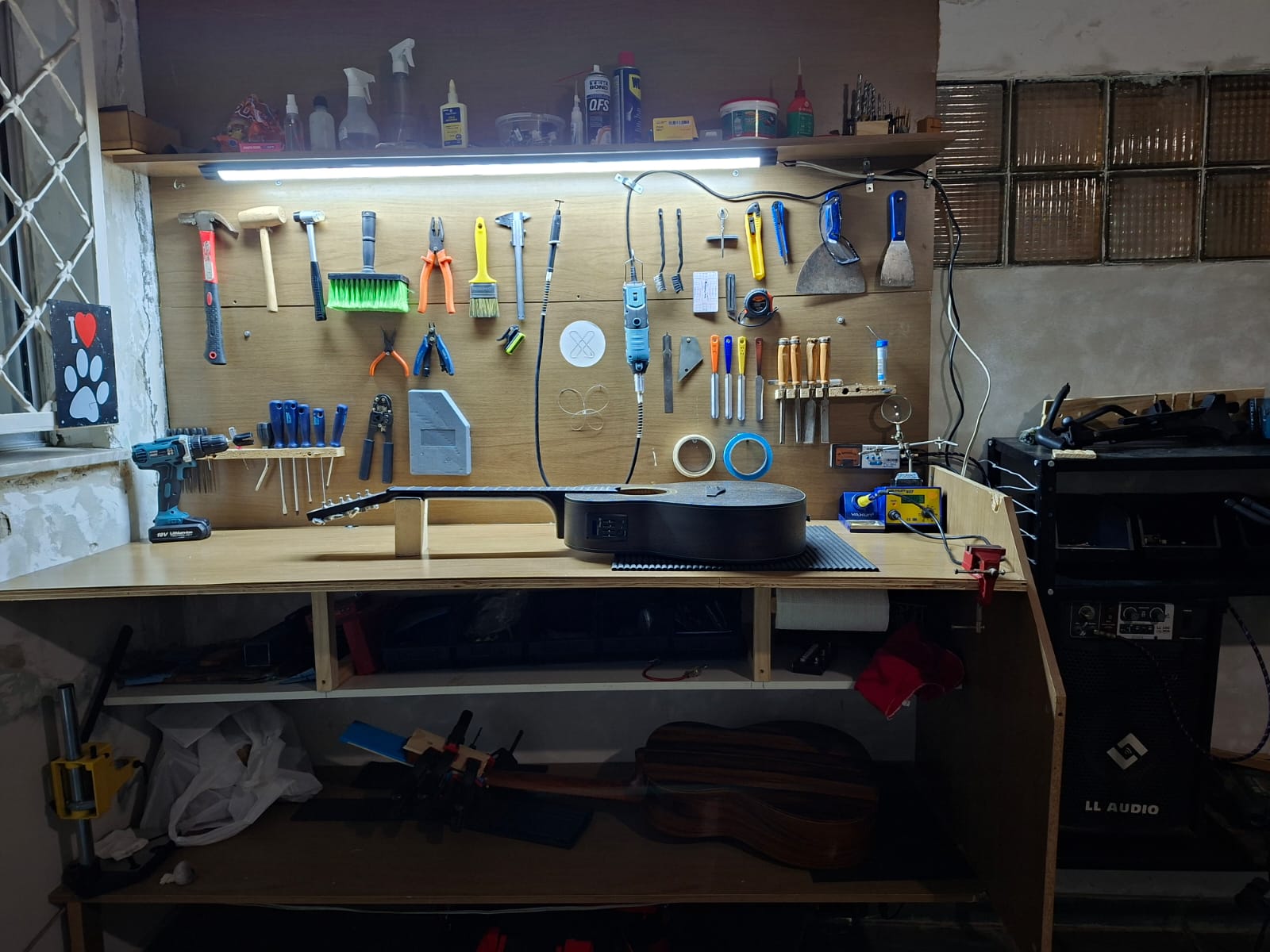 Nosso espaço de trabalho é cuidadosamente organizado, limpo e seguro, oferecendo as condições ideais para reparos, revisões e manuseio de instrumentos musicais. Cada detalhe do ambiente é pensado para garantir precisão, conforto e confiança durante cada etapa do serviço.